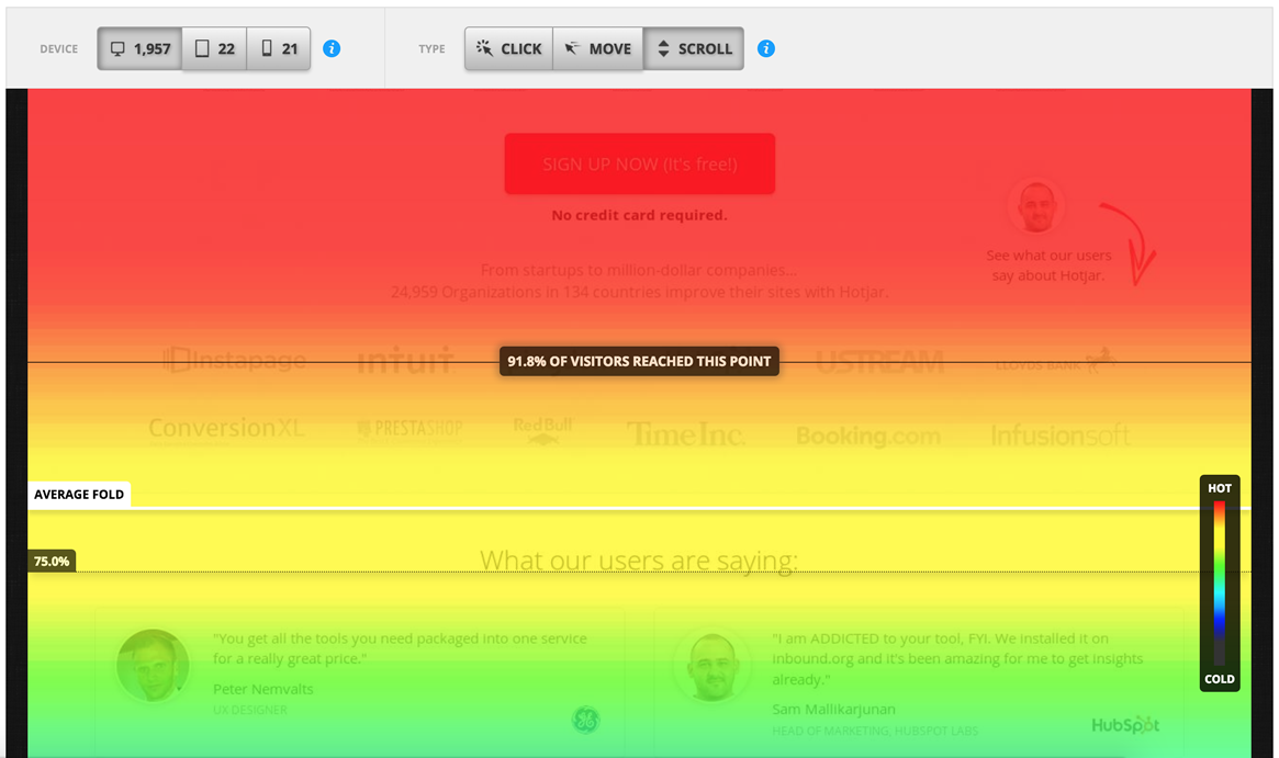 Using heat maps is a great way to help you determine where on average, the above the fold section is located for your webpage based on the specific site visitors your website attracts.