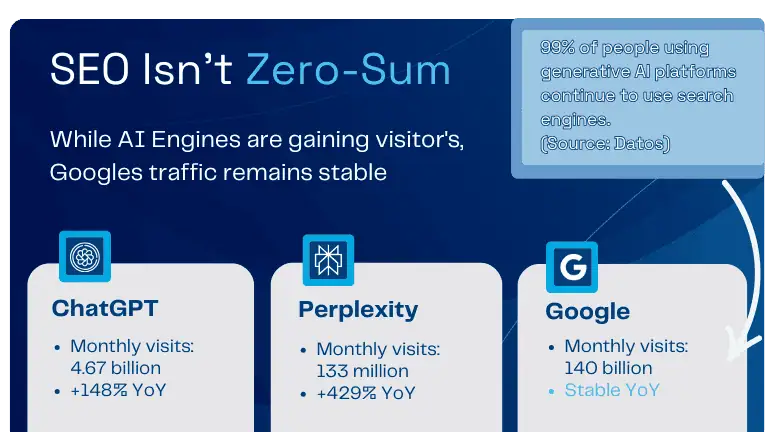 Despite alarming predictions about the death of organic search, the data tells a different story. Google recently revealed they process over 5 trillion searches annually — that’s more than 13 billion searches daily. For comparison, ChatGPT receives approximately 3 billion prompts per month.